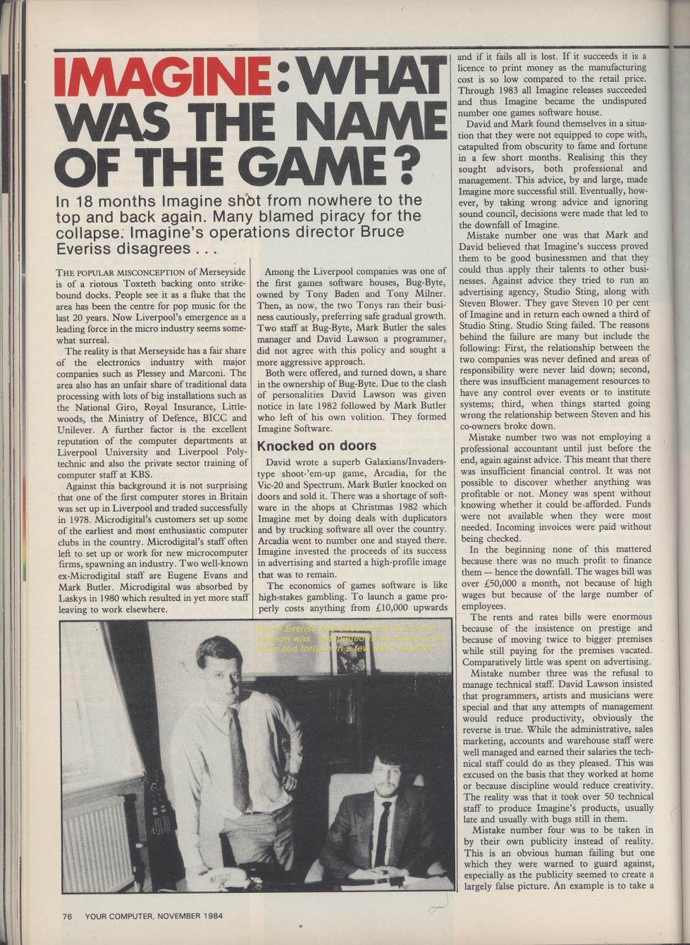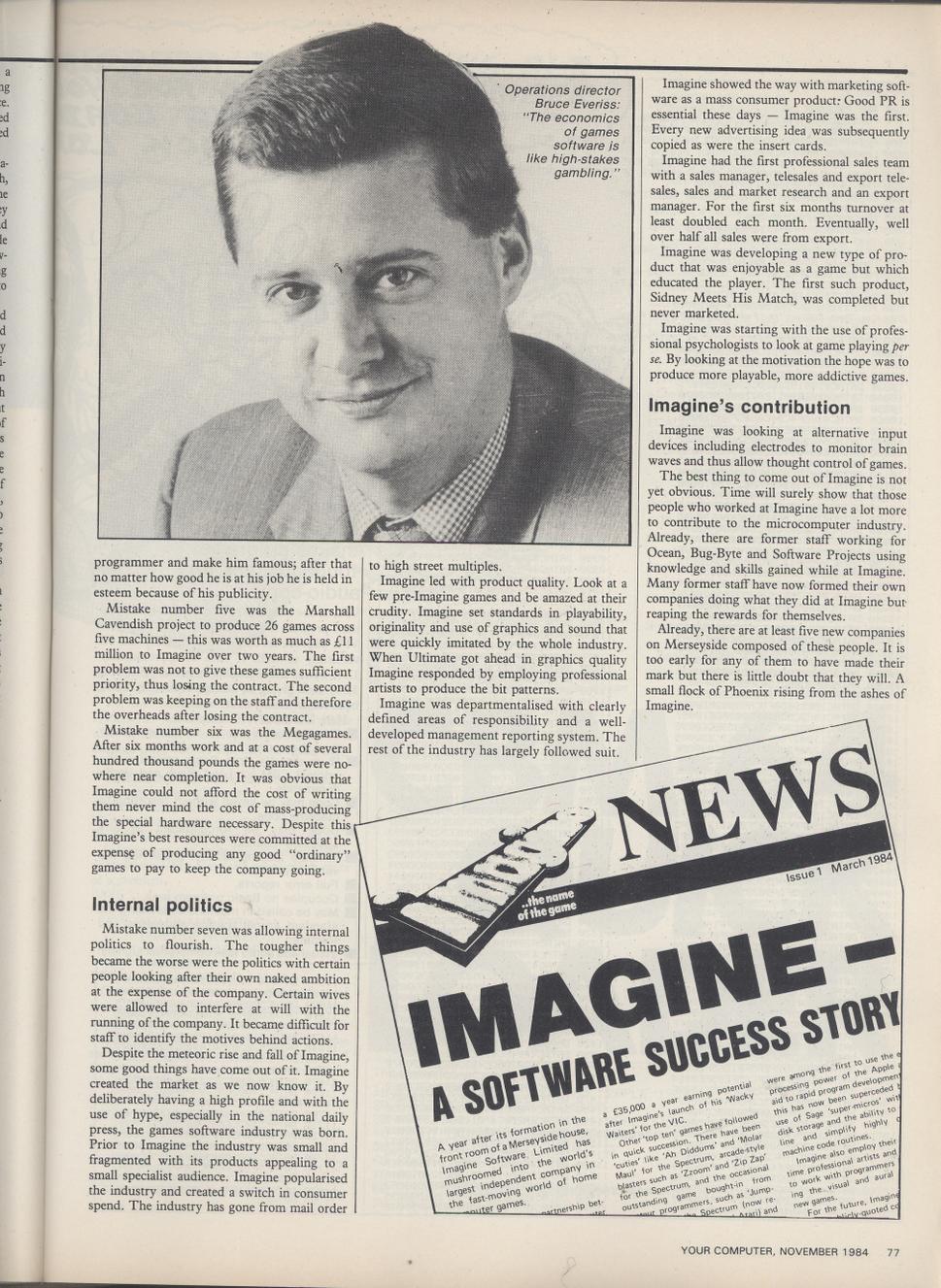 Browsing the internet I came across this interview of me in Your Spectrum from June 1984. It brings up several issues that were very pertinent at the time and which still have resonance today. They have never adequately been explained with the benefit of hindsight so I thought that I would do that now because things were not as they seemed. As a director of Imagine I was involved in all the discussions and decision making that went on behind the scenes. This is the definitive story of what happened.