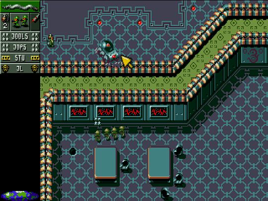 Mission info: This pretty easy stage is notable only for the first appearance of the alien "tank", which took the form of a big Dalek-style robot with a gun-turret head. Again, the appearance of a new device was intended to give the player an easy introduction - the Dalek tank will, if encouraged by careful trooper positioning, blow itself up by shooting against the wall in the screenshot above without the troopers ever crossing its line of fire.