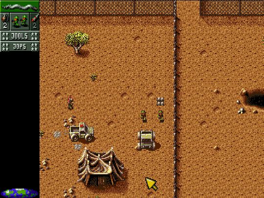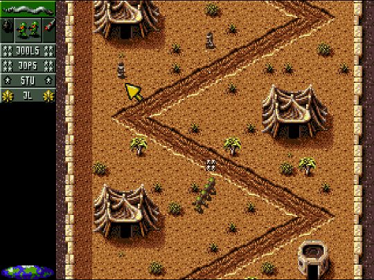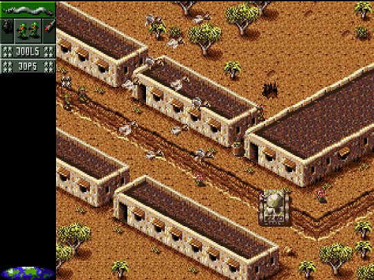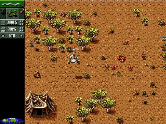 Mission info: This level introduces both the player chopper and the first hostage-rescuing mission, with the troopers charged with saving a poor unfortunate (who, had the plot still been in place by now, would have been in possession of vital information) about to be stoned to death by fundamentalist loonies guarded by enemy troops. The first task is to retrieve two crates of grenades from the top right corner, then use the "shockwave" method to blow up the two generator doors in the prison compound. After that the stage should be fairly plain sailing, though even with the hostage safe the unwary player should be careful of getting his helicopter blown up in the fenced-off section at the bottom left corner while clearing out the last clutch of enemy soldiers, leaving his trooper stranded behind the wire with no means of escape. With the important hostage rescued, the desert missions were complete.