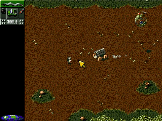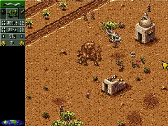 Mission info: This one's none too subtle, taking place on a single screen which, after a few seconds of peace and quiet, turns into an apocalyptic scene bursting with rockets, exploding buildings and hordes of enemy soldiers (the generator doors are set to maximum speed). It's the most extreme "panic" mission in the game, though giving the player only a single trooper makes it just about manageable without casualties, if you're really quick off the mark and accurate enough with your rocket fire to take out one or two of the enemy gun turrets before things get too mental. It's not a classic, but it gets you 15 extra troopers for clearing a whole mission in about 10 seconds, so don't complain too much.