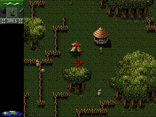 Background: The troopers are generously supplied with grenades and rockets, but the title was hinting at the fact that the best way to approach the level was with a single soldier, and that he might be employed in some kind of mounted capacity. It's a straightforward shootout, with the object being to carefully pick off the enemy emplacements and vehicles one at a time, and the trick being not to get the civilian huts (from which the inhabitants sensibly tend not to stray) between you and an enemy gun. The art of misdirection was a recurring theme in the design of CF2.