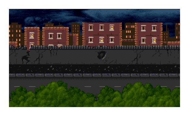 Background: This mission also introduced a quirk unique to the gangster stages of the game. The CF engine was designed to only operate with two vertical "levels" of 3D space, but I designed the gangster levels to have buildings of many different heights. This meant a certain inconsistency with the troopers' ability to shoot or throw grenades down long ladders, as well as an inability to walk "behind" tall buildings, since the game included no mechanism to map characters who couldn't be seen. These were easily explained away - "Well, the grenades explode on a timer, obviously, and the tall buildings just happen to have other stuff behind them that you can't see, which is why you can't walk there" - but a few players did raise objections. JL and I were aware of the perspective issues when we were making the missions, but decided that it made for such atmospheric stages we'd do it anyway. I've never regretted the choice.