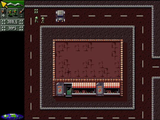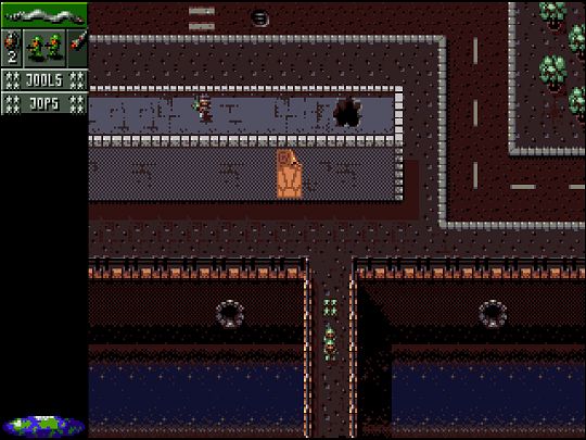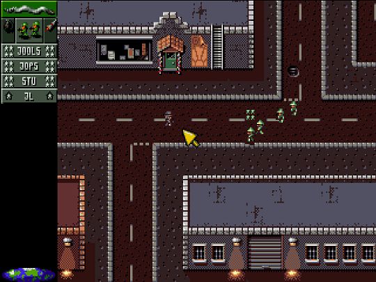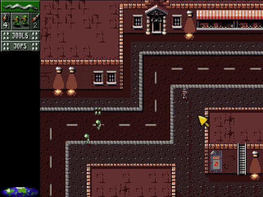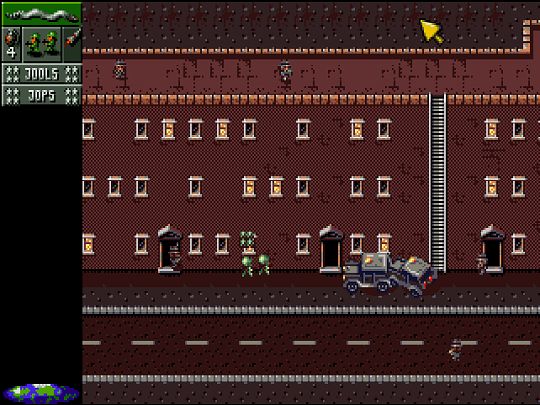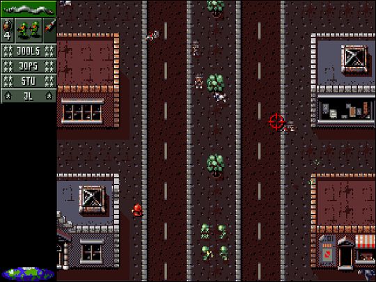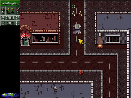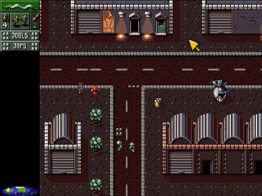 Mission info: This level takes the form of a single vertical avenue with dual carriageways running its entire length, and introduces the gangster form of the enemy jeep, in the shape of an Anthill Mob-style 1930s Mafia saloon car. There are plenty of fire hydrants by the sides of the road and bushes down the central reservation to trap the two "jeeps" against, enabling the troopers to take them out with grenades, leaving two to blow up the generator doors. It's not a particularly tough stage, but in the light of Jops' subsequent comments (see Mission 7 Phase 1) it might have been nice to give the player a couple of spare grenades here just to have a little fun with.