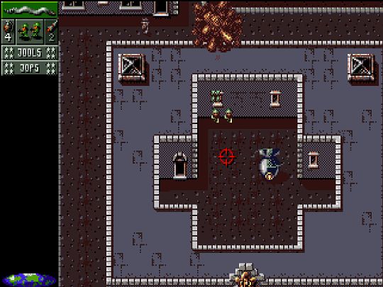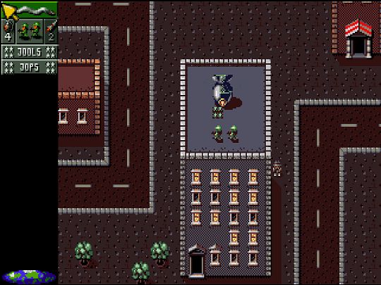 Mission info: The troopers are provided with a player transport chopper right at the start of this stage, whose main purpose is to provide access to the two crates of rockets at bottom left. This is one of the few levels in the whole game where the troopers are provided with a plentiful supply of explosives, there being enough rockets and grenades to take out every generator door and Mafia car with at least half a dozen left over. This was partly compensation for the absence of obstacles with which to slow down the moving cars, but since they were, as far as the game was concerned, "civilian" vehicles and so always drove in a straight line along the road, they were pretty easy to hit anyway.