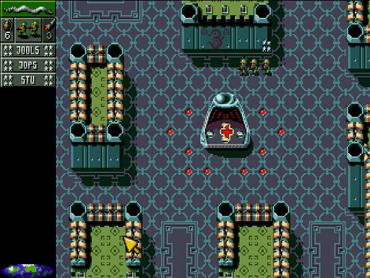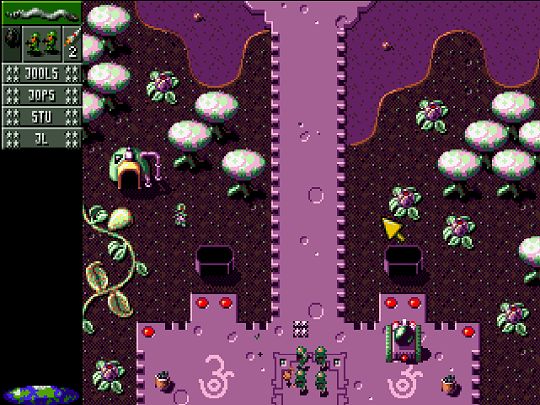 Mission info: This is a long and winding level in the shape of an "S", with only one route through it. There's plenty of ammo to do the job and you shouldn't have too much trouble even from the two gun emplacements at the end, but there's a catch - you MUST keep both your troopers alive, or you won't be able to trigger the switches that summon the UFO to come and take you to the next setting. If either of your little guys gets killed, it's start-the-level-again time.