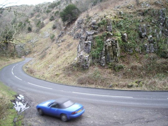 After a long climb to the county line, the road begins an extremely gradual descent into the bowels of the Earth. Initially driving down a barely-perceptible incline across an open, empty plain, you scarcely notice the scenery slowly closing in, claustrophobically rising higher and higher on either side of you, like those parts of the London tube system where the occasional overground station is swiftly, jealously swallowed up into the darkness once again. As your horizon shrinks, the road also changes from a straight line to a corkscrew twist, barely going more than 20 yards without a dramatic swerve through at least 60 degrees, first one way then the other. And then you start seeing goats.