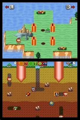 The first two Dig Dugs were radically different games, and playing them simultaneously (the original on the bottom screen, the sequel on the top) makes for a confusing experience, where you're never quite sure which of the two you should be focusing on. (Perhaps it's trying to simulate the addled mental condition of senile old Grandpa Dug.) Is it more important to clear out the monsters on the bottom screen, or should you largely ignore them in order to concentrate on sinking chunks of the island on the top screen? Throwing in several little power-up sub-games based on other Namco classics like Rally-X and Xevious doesn't simplify things any either, and in the end you find yourself admiring the inventiveness of combining the two games into one, but not actually wanting to play it very much. 5/10