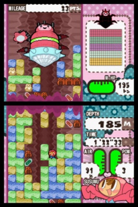 Drill Spirits is a respectable, middling sort of Driller game. It lacks the sophistication of Strange Bacteria (the Japan-only sequel on GBA), the fun of the "Drindy Adventure" game in Gamecube incarnation Drill Land, and the addictive genius of "Endless Hard" more on the GBA's Mr Driller 2, but on the upside the extra screen comes in handy for seeing stuff that's about to fall on your head. Hours of solid, but rather unimaginative, entertainment for existing Driller fans, and a good sound introduction to a classic for everyone else. 7/10