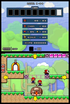 Rather than playing Mario himself, each level of MVDK2 gives you control of a bunch of clockwork-toy facsimiles of the little fella (usually two, three or four). You move them around not with the d-pad but with the stylus - nudge a mini-Mario in one direction and it'll keep moving that way until you tap it to make it stop, and flicking it upwards will make it do a little jump. Your job is to guide your team to the exit safely, collecting coins, letter cards and power-ups, and flicking switches to open doors, move lifts and redirect conveyor belts to guide your little guys safely around the various obstacles and enemies on each level. The main problem is that the levels are so big you can rarely see more than one Mario at a time, so you have to constantly scroll around with the d-pad while moving the mini-toys with the stylus (which doesn't quite have the precision to respond as quickly and accurately as you'd hope), trying to remember or guess where the others are and what they might be up to.