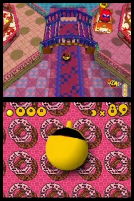 Namco, on the other hand, have given Sega a bit of a lesson in how to build a world around a control method. Pac'n'Roll uses the DS's input in exactly the same way as Super Monkey Ball, but the levels are far more "enclosed", allowing the player to whizz around them with speed and fluidity but still be able to recover from mistakes. Design-wise it's a little more akin to something like Pandemonium than the Marble Madness-derived SMB, with a pretty limited amount of freedom, but the linearity is well-disguised and unobtrusive, and helps to ensure the game keeps moving along at a lively pace. It gets slightly over-complicated later on as more Pac-moves are introduced, and there are a few minor camera issues, but if you're looking for a fun ball-rolling game for your DS you'll almost certainly find yourself more entertained by this one than its more celebrated counterpart. 6/10