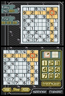 These two go together, obviously, because the other big selling point of Dr Kawashima's Brain Training is its collection of Sudoku puzzles, so if you plump for Big Brain Academy you'll need to buy your Sudoku game separately. Of the two Sudoku games released in the West, Gridmaster is the slickest by a long way, with a simple and intuitive interface (you wouldn't believe what a mess Sudoku Mania manages to make of it) constructed around a whopping catalogue of 500 puzzles, arranged into four difficulty groups (the numbers weighted towards the harder groups). In a nice bit of attention to detail, you can either tap numbers to fill in the boxes, or write them on the touchscreen. You can also earn the right to tackle "rank tests", and the game keeps star ratings and record times for individual puzzles, so this is all the Sudoku you'll ever need. (If, indeed, you need any Sudoku at all.) 6/10
