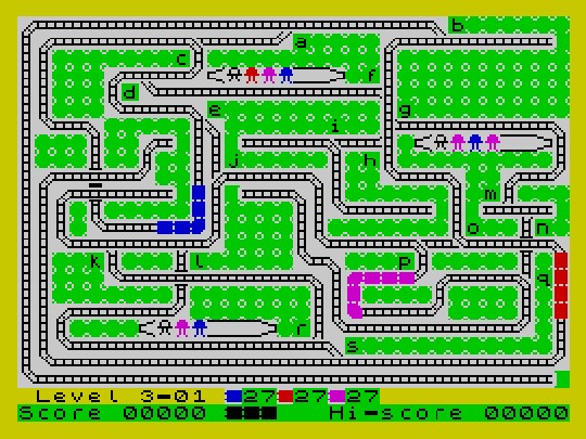 The trains couldn't stop (except at stations, and only then for a fixed brief period), couldn't pick up passengers of other colours than their own (except the angry ones who'd turned white, who took precedence over all other passengers and could be collected by any train, but only at the cost of leaving any waiting passengers of the train's own colour behind on the platform), and couldn't be reversed. Each set of points could be set to two positions only, meaning that if you wanted to make a train reach a certain station, you'd often have to route it through a long and complex diversion in order to make it travel in the opposite direction down the line it was currently on. Oh, and sometimes, at the highest of the game's seven difficulty levels, a hurtling runaway goods train would appear and have to be sent into one of the tunnels at the side of the screen to get rid of it. Man, you kids today have it easy.