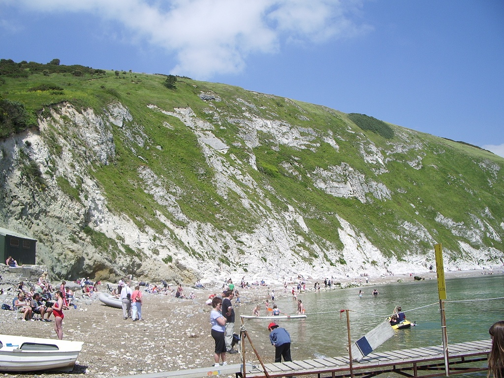 For such a tiny little place, Lulworth has a lot of map presence. There's East Lulworth, West Lulworth, Lulworth Castle and Lulworth Camp, but the tourist destination is Lulworth Cove. A lucky accident of nature, it's a beautiful sheltered little scallop-shaped bay, only a couple of hundred yards in diameter. You come upon the adjacent village rather suddenly, several miles down a narrow and twisty country road, and are immediately confronted with a startlingly large number of cars in a massive car park that's occupies almost as much space again as the entire village itself. And if you find that startling, you're in for an even nastier surprise, as you're about to be robbed of the extortionate sum of £2.50 to deposit your own automobile amongst the crowd of others for even five minutes.