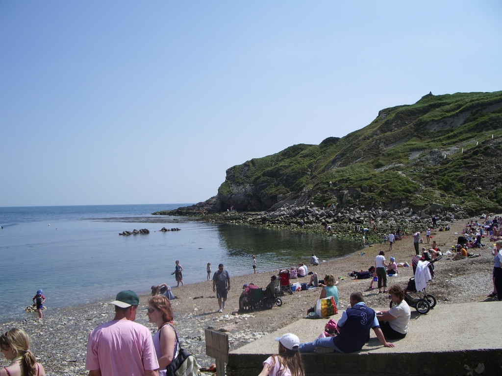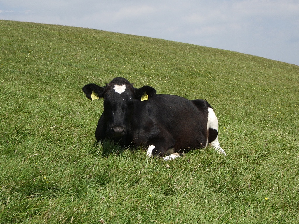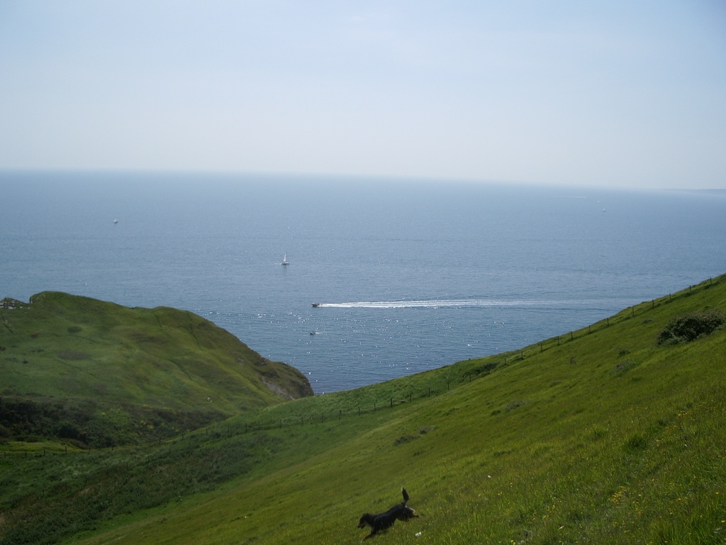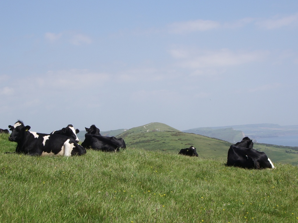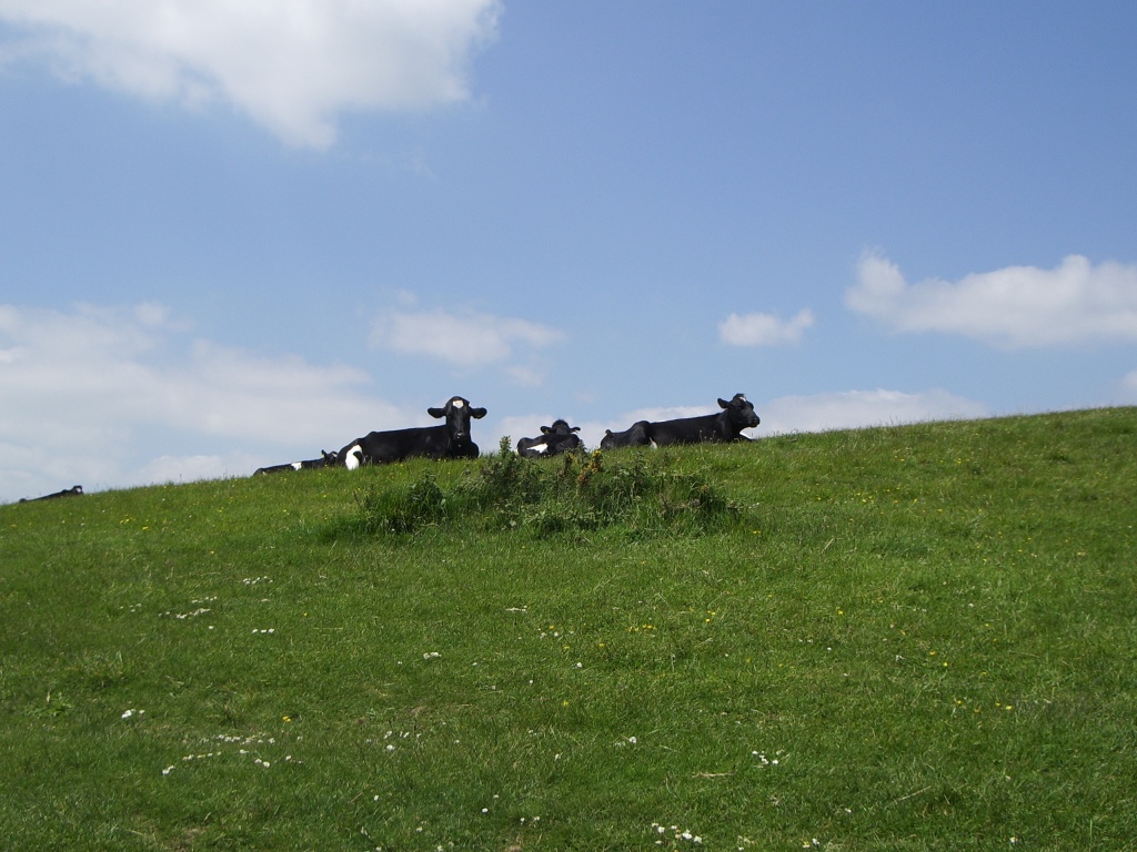 (Man, I thought they'd never leave. Anyway, what you get for conquering the climb is a rather lovely panoramic view of the cove and village to the east, some charming white cliffs and shoreline to the west, and - at least on the day WoS visited - a close encounter with some grazing cattle basking imperiously in the sunshine. I think they were Fresians, but I'd need to ask my dad for a definitive answer, and he's not here at the moment. It's certainly a lovely spot, and the hike passes some time and gets some value out of your car parking, but if you're very unfit or in a wheelchair or something, it's probably not worth the heart attack.)