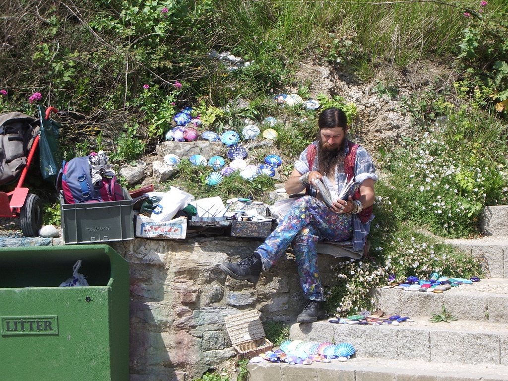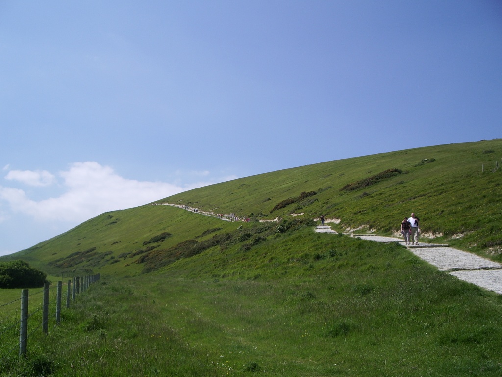 On getting out of the car, there's little sign of what you're supposed to do next. Coming in by road you don't actually see the cove itself, and the east side of the car park borders on what looks like a nondescript residential village. The west side, on the other hand, opens out to a long white path cut into the steep chalky cliffside, marked with information posts and busy with walkers, and which therefore seems to be the logical way to go. So naturally, your reporter assumed that the cove lay at the end of this daunting trek (it's MUCH steeper than it looks in the pic), and maybe the car park was only so far away from it to avoid spoiling the scenery or something, and set off up the hill in the blistering June heat.
