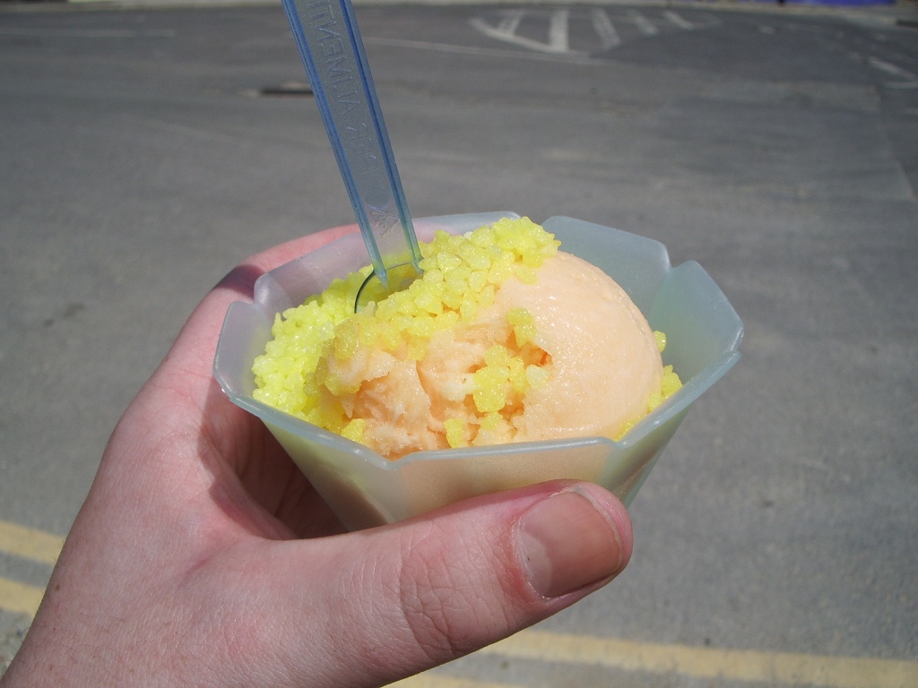 Returning down the path and into the village, you'll be ready for something cold and rewarding, and this snack-loving reporter heartily recommends the orange sorbet from the café at the edge of the car park, served in a cute plastic cup by a pretty girl with delicately freckly skin. With the benefit of experience, though, you might find it wise to decline the opportunity to spend an extra 20p adding lemon crystals to it, as rather than being excitingly fruity or fizzy, they taste mostly of sugar and take the edge off its refreshing citrus bite.