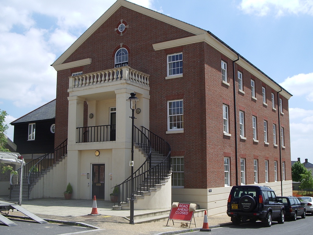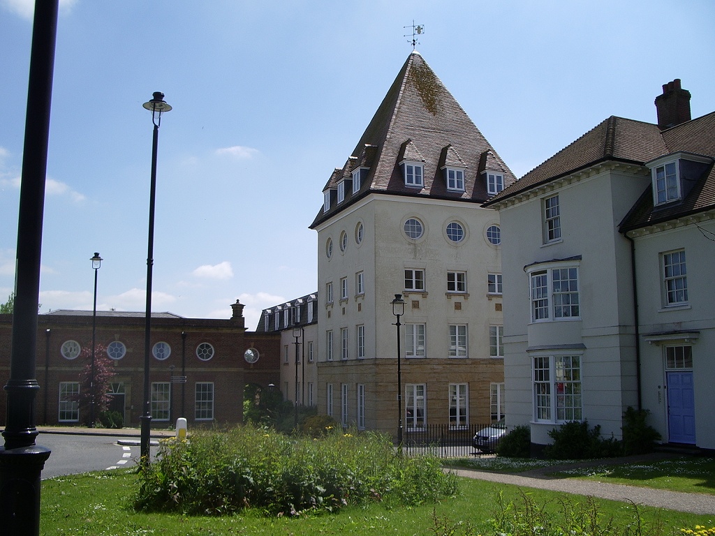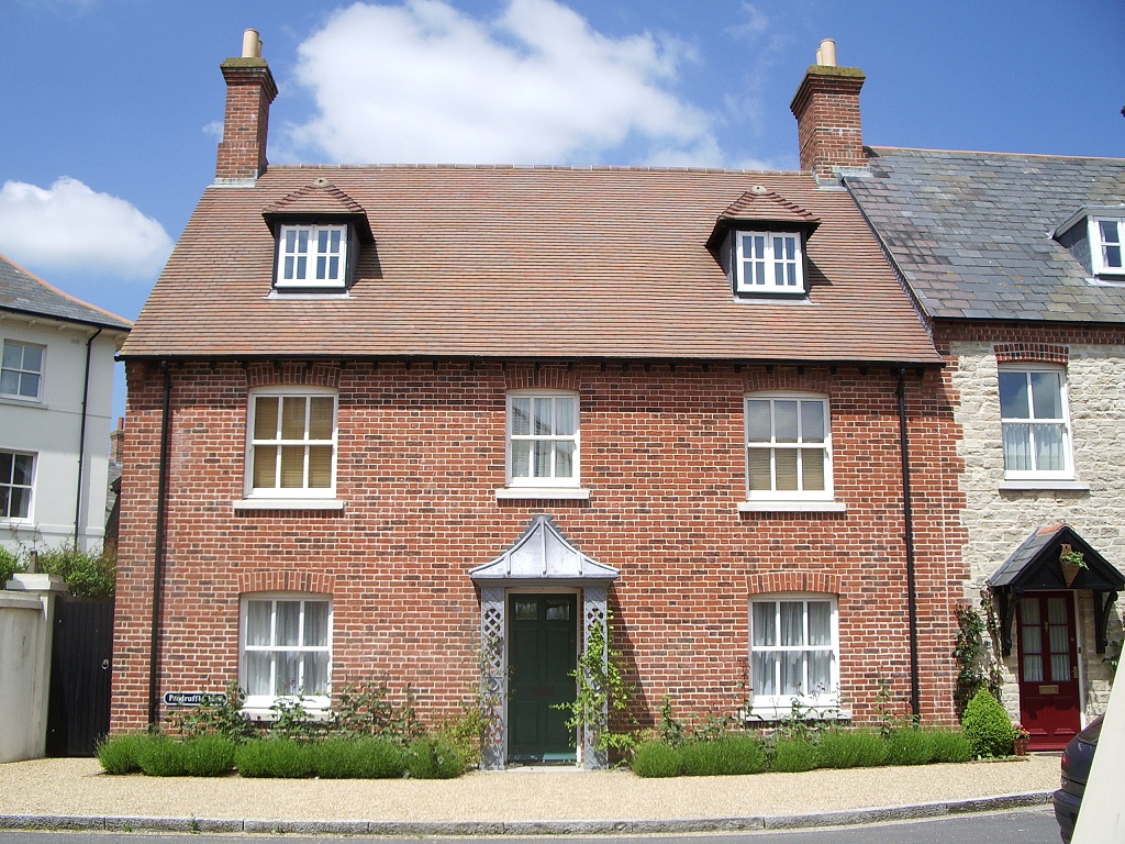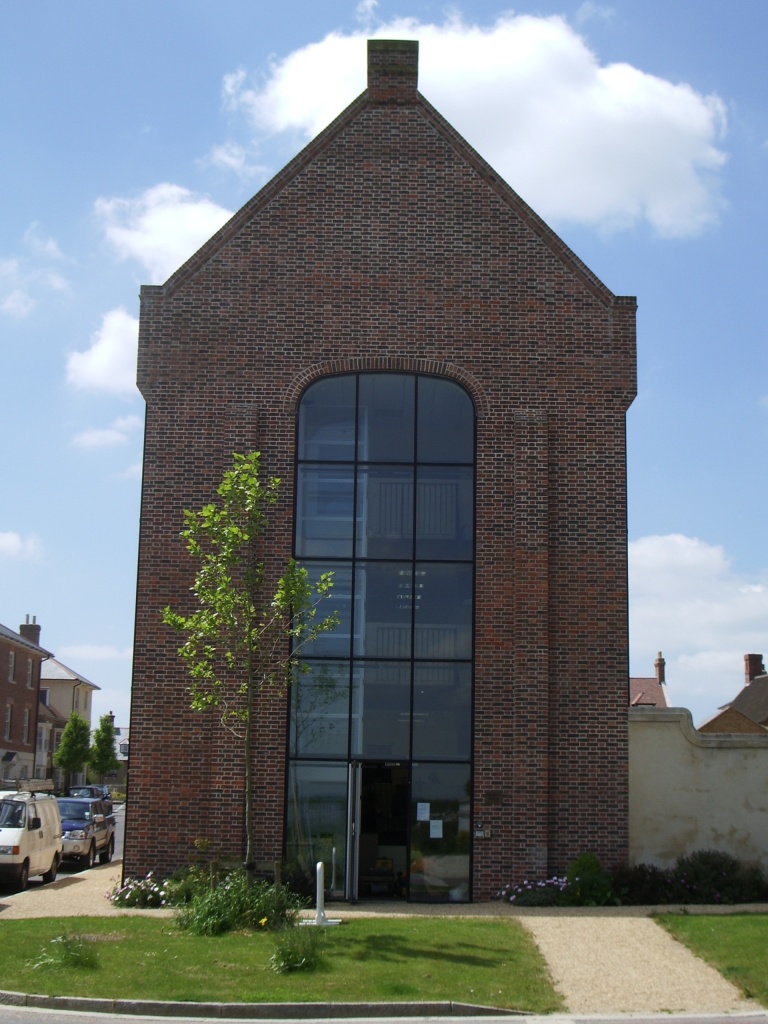 The area occupied by Poundbury is roughly 400 yards square, and walking around it is a bit like watching a DVD of the history of English architecture on fast-forward. Turn any corner and you'll find buildings in a completely different style to the ones on the next street. I'd expected a creepy uniformity, with Neighbourhood Watch patrols checking that nobody had painted their front door an unapproved colour (though apparently there ARE rules about that sort of thing) or exceeded the permitted levels of garden-gnome cheekiness, but in fact it looks as though the place was built by anarchists. Thatched-style (but not actually thatched) cottages sit turret-by-cupola with Georgian terraces, Edwardian villas, traditional Coronation Street red-brick, and urban-modern gable-ends with glass cutaway panels. (And weirdly, almost like some kind of freakshow, a single derelict old ruin right in the middle.)