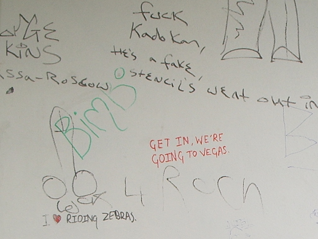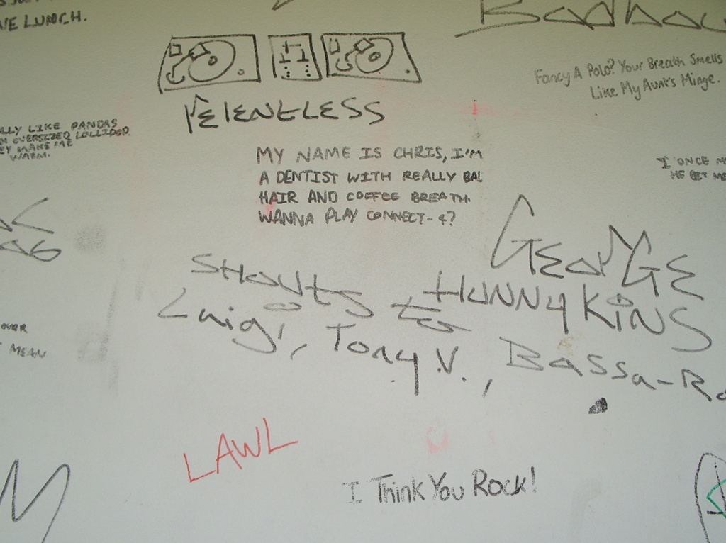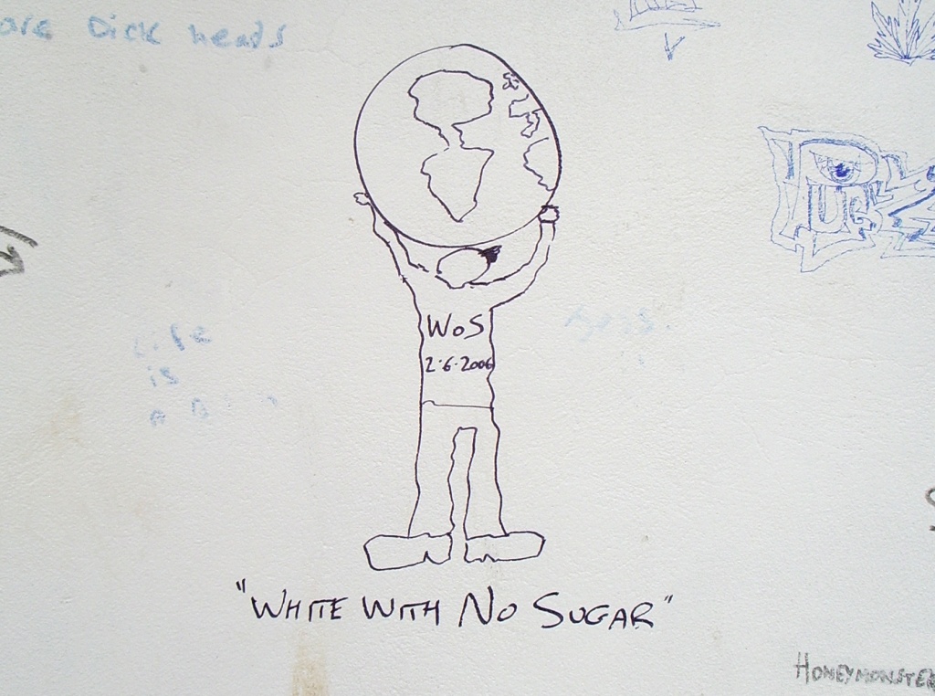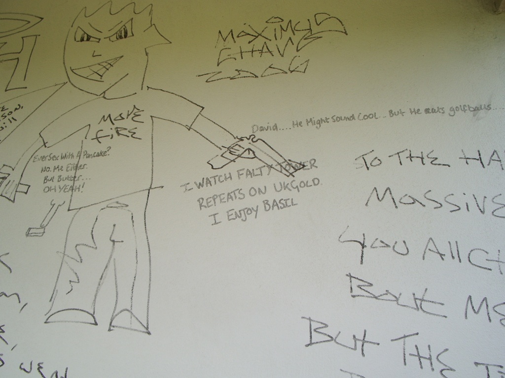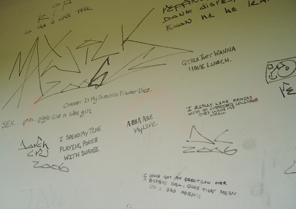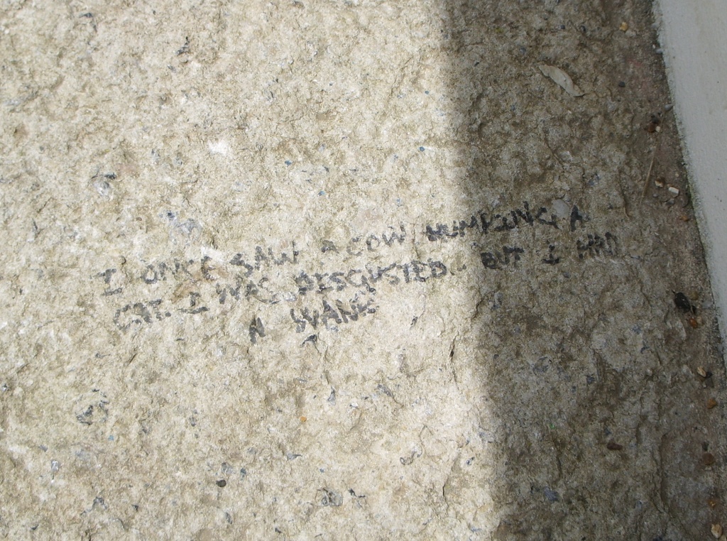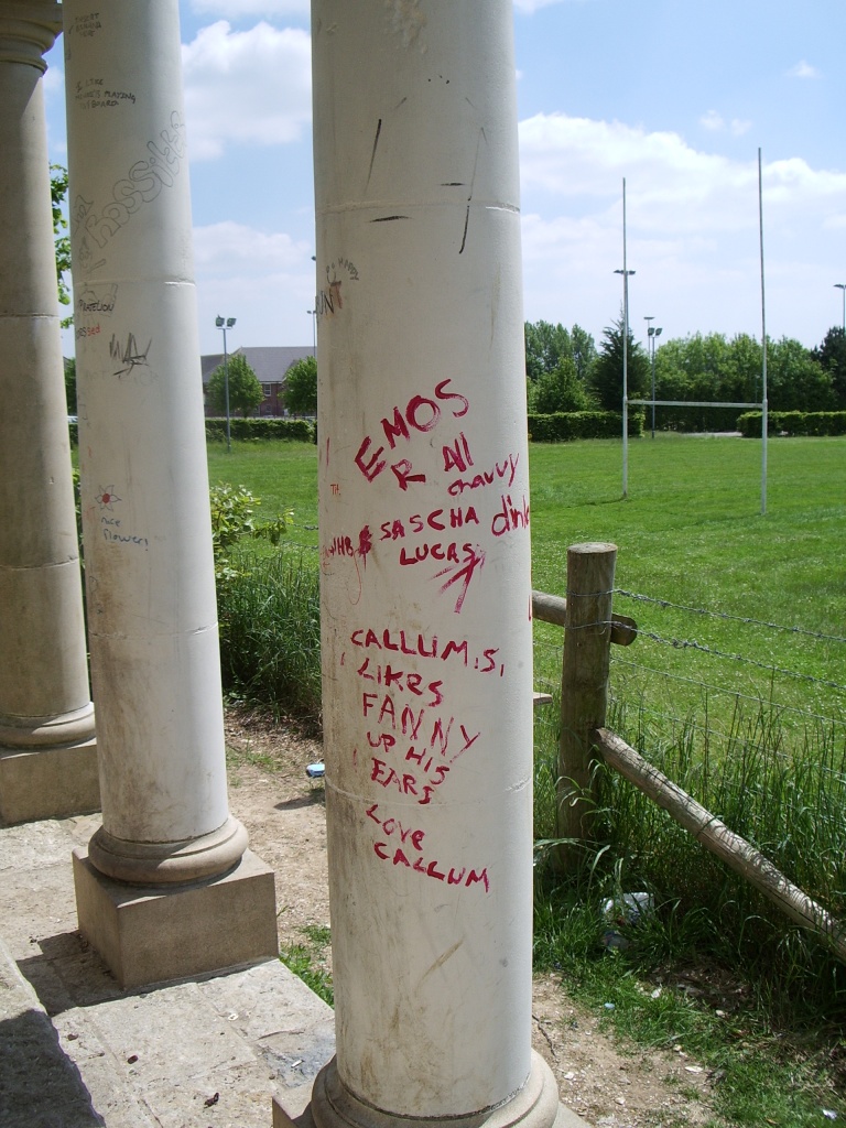 The shock of the rear of the Inexplicable Pavilion was akin to the sensation of having a bucket of cold water thrown on your face when you're sitting slumped against a wall on the floor of your friend Louis' house in a drunken stupor after spending an extended lunchtime drinking pints of cider-and-Pernod (er, for example). Where every other white surface in Poundbury was immaculate and virginal, the pavilion's back wall (which, perhaps crucially, isn't overlooked by any houses) was an explosion of surreal, disturbing and anatomically- questionable middle-class graffiti. Including, in what's a suspiciously neat tie-in with the beginning of this feature and which doubtless goes to prove something tremendously deep and significant about human nature although WoS doesn't know what, a big cock.