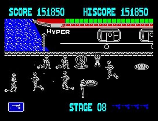 Amazingly, your police bloke (bottom centre) is now unable to move to the right. In fact, he's completely stuck - in the Speccy version he can only kill the criminals in the manholes with the bazooka weapon (which he's already used to clear the bottom one, but has then lost the weapon by shooting a civilian). He can only get the bazooka back by rescuing a civilian (in this case the little boy beside the upper manhole), but because of the collision detection there's no way to get to the boy. All you can do from this point is reset the Speccy, reload the game and start all over again. |