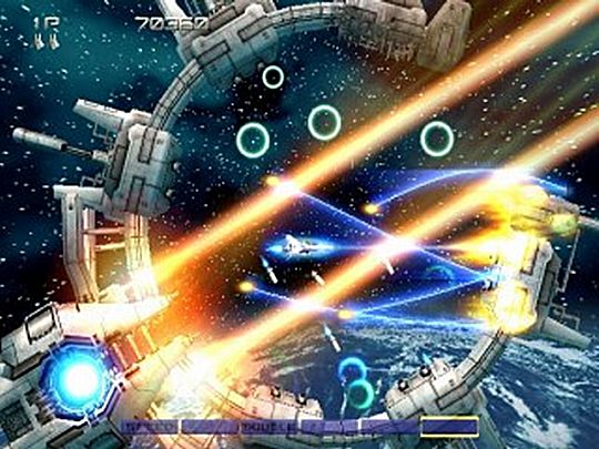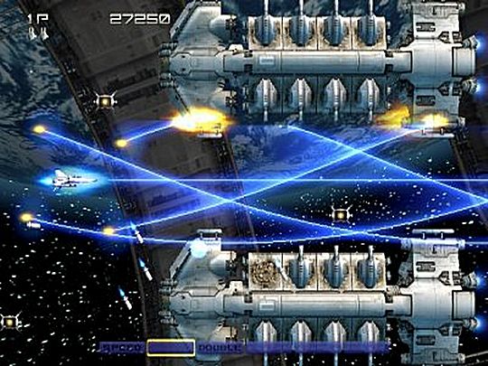 Type 1 Options can fire in a different direction to the main ship, allowing you to shoot (say) behind and above your ship while it continues to fire straight ahead. The second type can be locked in position, allowing you to spread your fire across a wide range or concentrate it all into a single lethal line. Type 3s (the least useful, in this reviewer's experience) can be stretched out above and below your ship at various distances, and the fourth type spin around it in a close protective circle. Complicating the choice is the fact that Type 2 and Type 3 Options fire a standard fixed pulse laser, while Types 1 and 4 emit a continuous one, which bends as you move (see the pic below) and provides a more complete field of fire.
