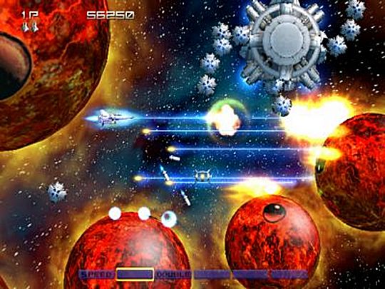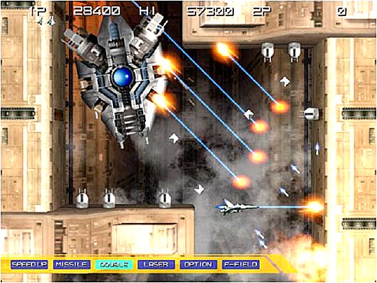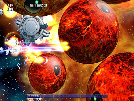At the heart of everything that makes Gradius V wonderful is one simple but all-important change to the core gameplay. Previously, getting killed in a Gradius game cost you all your "Options", the invincible drone ships that were the original title's most pioneering feature. The game was so centred around the player's accumulation of Options that bereft of them, the player stood next to no chance against the fearsome onslaught of later levels, given that a full complement required the collection of at least 20 power-up tokens from vanquished enemies. And any distance at all into the middle or later stages of a Gradius game, your unenhanced ship would be lucky to survive long enough to pick up three.