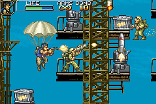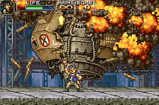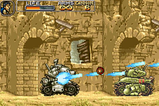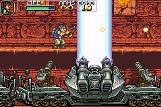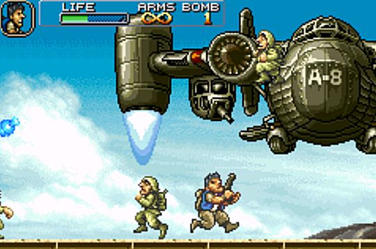 But the home versions of the Slug games have always kept a little flicker of hope alive. Freed from the need of having to keep players pumping in more coins every 30 seconds, the console ports have been a lot more worthwhile, from the PS1 release of Metal Slug X with its mini-missions and single-life endurance mode, to the two inventive and different Neo Geo Pocket versions, to the neat "Storming The Mothership" and "Fat Island" bonus games added to the Xbox port of MS3. So it was with cautious optimism that your reporter approached the latest in-home Metal Slug, an all-new MS for the GBA. And, for once, your oft-disappointed correspondent's optimism was rewarded.