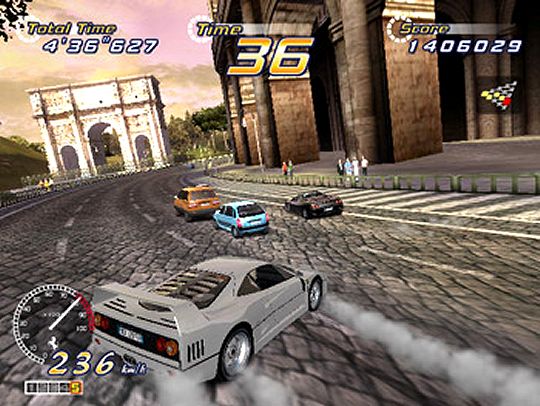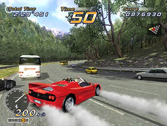 Now, you might be thinking that that sounds like a pretty gruelling prospect. And when you factor in the knowledge that OutRun 2 adopts the Mario Kart model of opponent AI (which is to say, artificially slowing the car in the lead/speeding up the one behind so that the gap between them is always kept fairly small), it appears to be a recipe for disaster. Because what could be more soul-crushingly awful than to lead your opponent through 29 stages, crash right at the end, and see them whip past you over the line because the game had unfairly handicapped you for being in the lead, right?