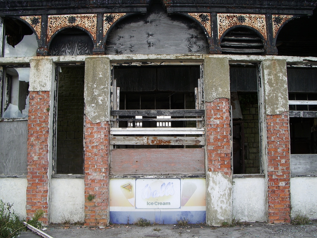 The first clear view of the pleasure pier takes in the clocktower and the main pavilion. The pier was finally officially closed down as recently as 1994, but most of it's been neglected for much longer than that. (The last paddle steamer, which the pier was originally built to receive trippers from, disembarked its passengers onto the north jetty in 1979, twelve years after the pier celebrated its centenary.) The buildings seem to have been abandoned in an air-raid hurry, and odd, poignant remnants can still be seen, like the torn purple-and-gold velvet curtain fluttering in the window frame beside an old ice cream kiosk.