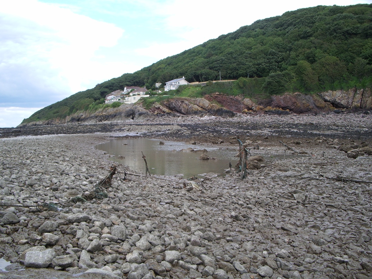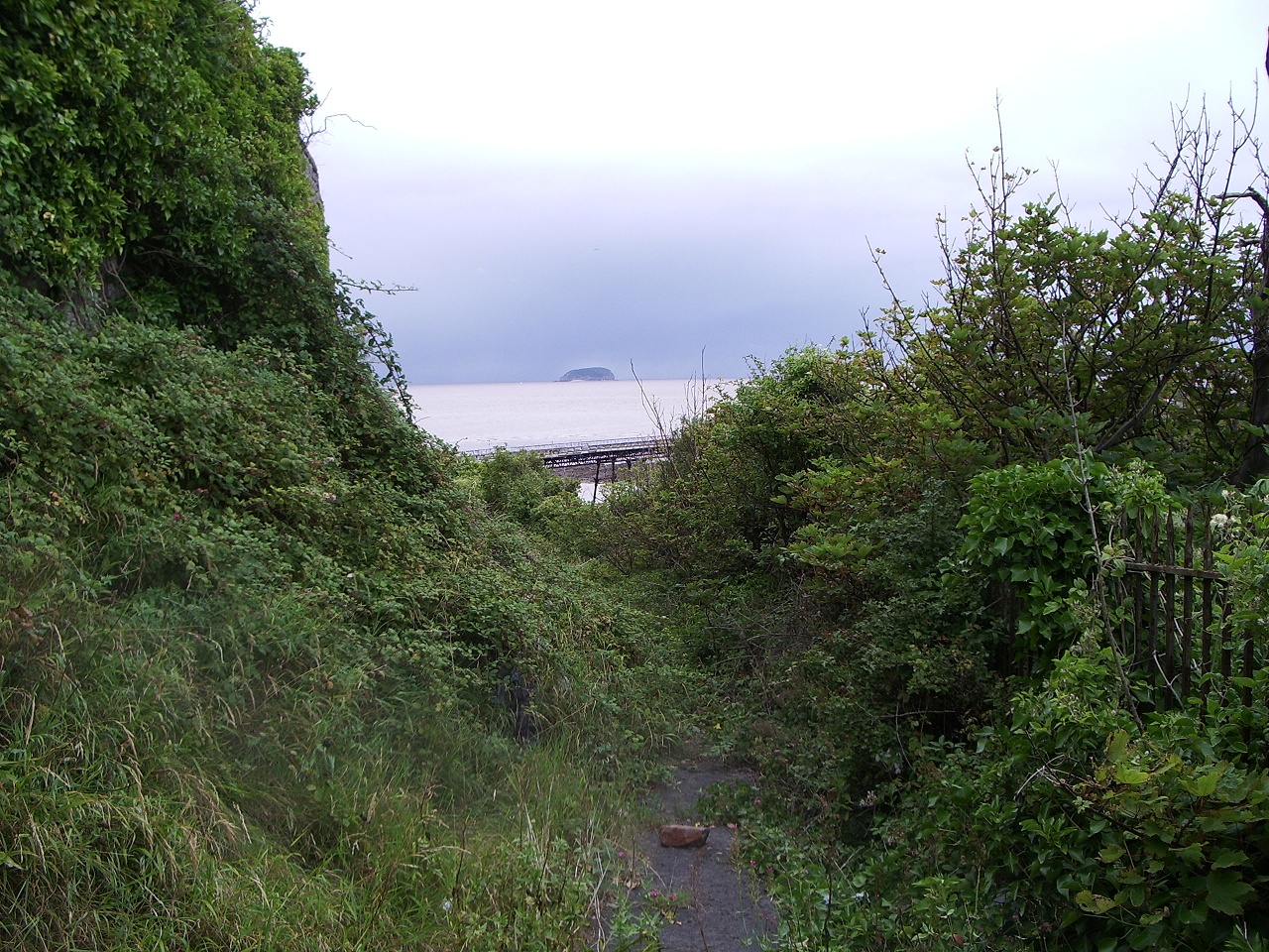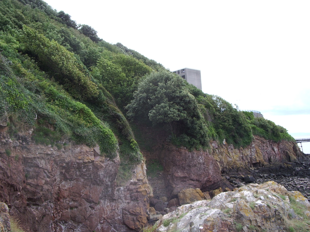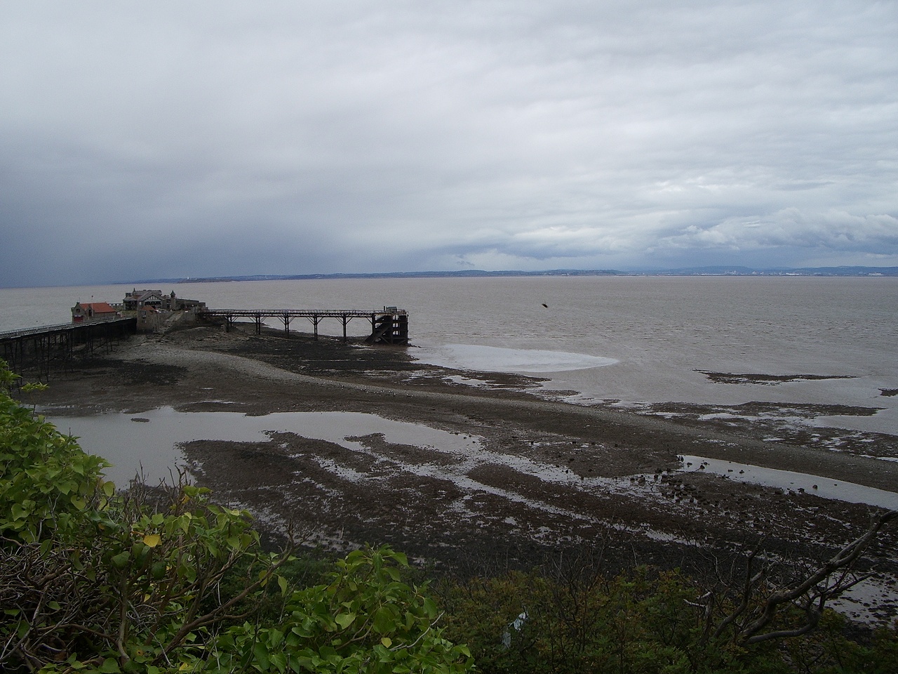 Even if you're fortunate enough to encounter the rare view depicted above, though, you've still got a lot of work to do. The sea at Weston-super-Mare recedes at an angle, with the waterline running roughly parallel to the ridge and moving from the bottom-left corner of the picture towards the top-right. However, the topography of the seabed means that it's essentially impossible to approach the pier on foot from the south side (the left of the shot), and the north side is protected by sheer cliffs maybe 80 feet high. There's just one point where you can find a navigable route from the road down to the shore, leading across a crash-barrier, through a gap in the trees and over some bramble-strewn undergrowth, then descending a precipitous slope onto a wide ledge from where you can walk along a few dozen yards and relatively easily slide the last 20 feet down a smooth 45-degree rockface.
