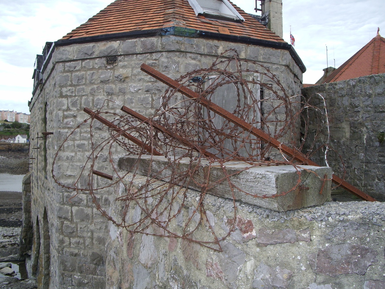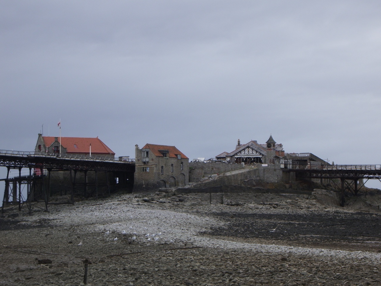 It is until you look up. The winding route you have to take to get from the foot of the cliffs to the pier slipway covers a total distance of maybe 600 yards or so. Which isn't very much on dry land, but it's a hell of a lot longer when you're picking your way slowly and carefully across what you're only too aware is the sea bed for 361 days of the year, there's a bone-slicing gale howling down the shoreline, and you know that your information about the tide times is wrong, but you don't know by how much. Looking ahead, you see the picture above - a forbidding, desolate island, rusting and rickety and razor-wired, promising only danger and isolation. Looking to the side you see the cold and filthy sea, stretching infinitely to the horizon but not quite far away enough for comfort, and seemingly moving incessantly towards you (as, of course, the sea always does). And looking back, you see this: