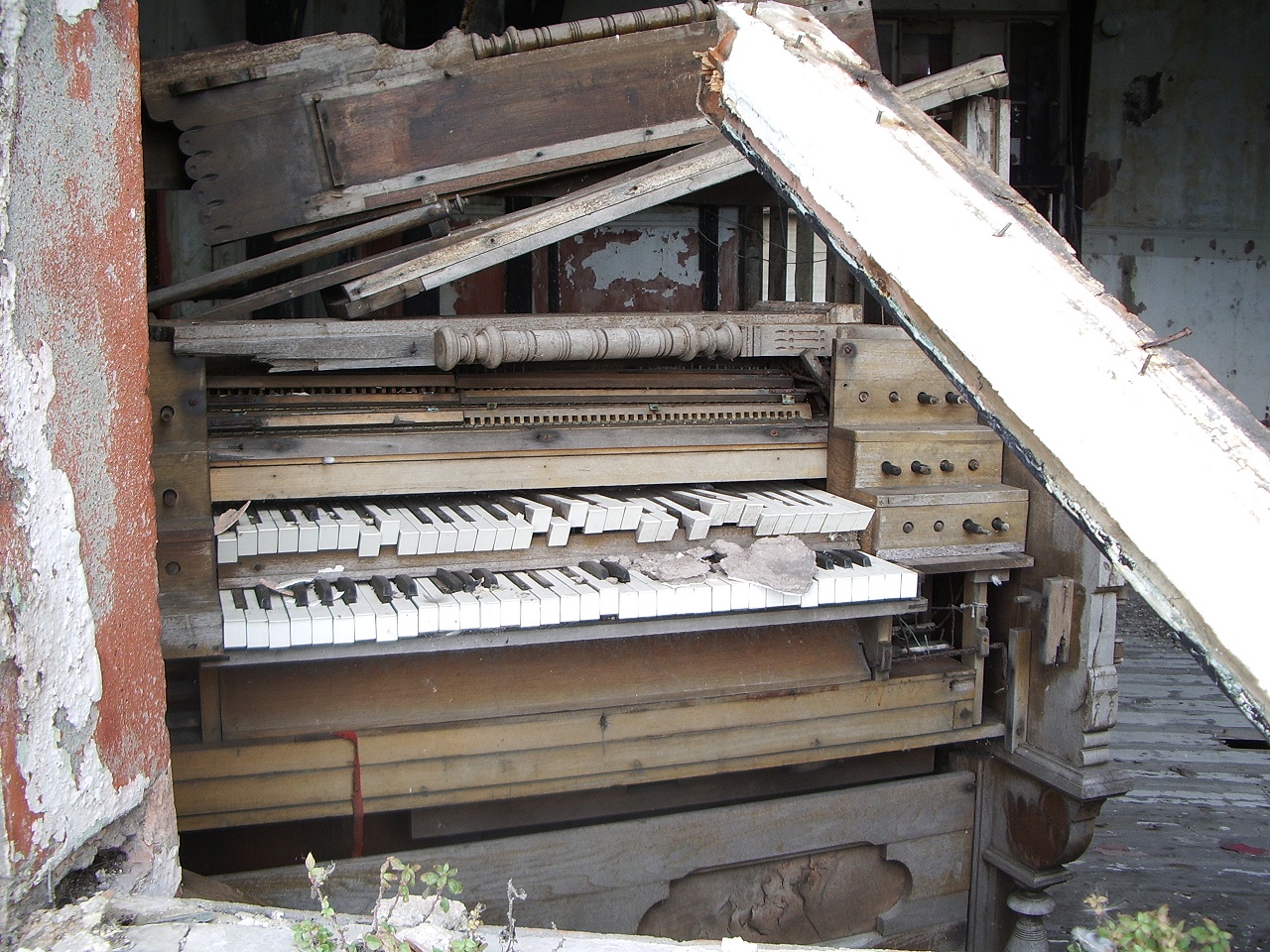 Of greater surprise are the more substantial items left behind - you'd think that either whoever owned them would have had some kind of use for the splendid buggy whose rusting frame adjoins the turnstiles leading to the jetty and the magnificent organ found by a window of the main hall, or that some enterprising thief would have swiped them for salvage long before now. But still they stand, as if waiting
