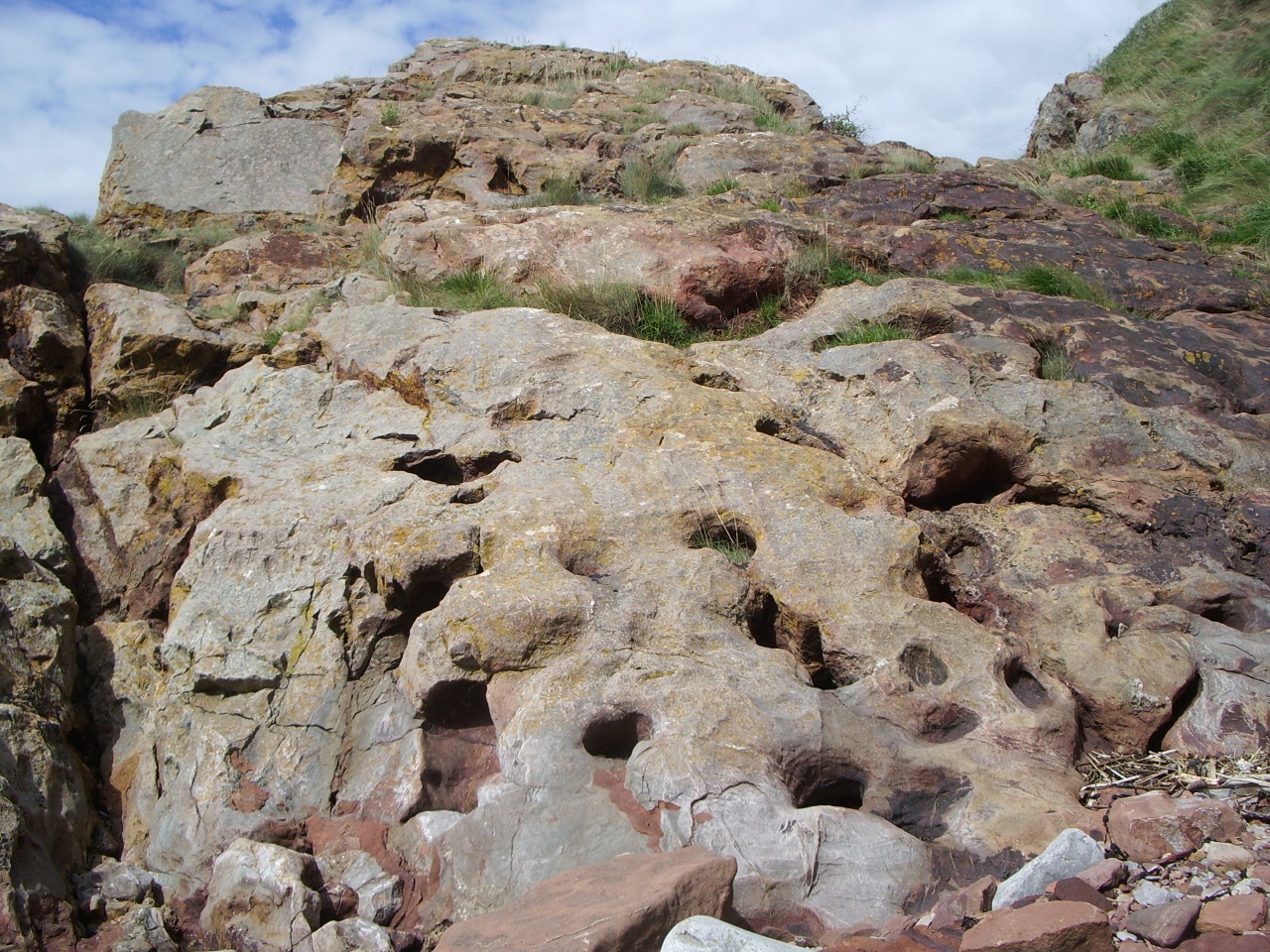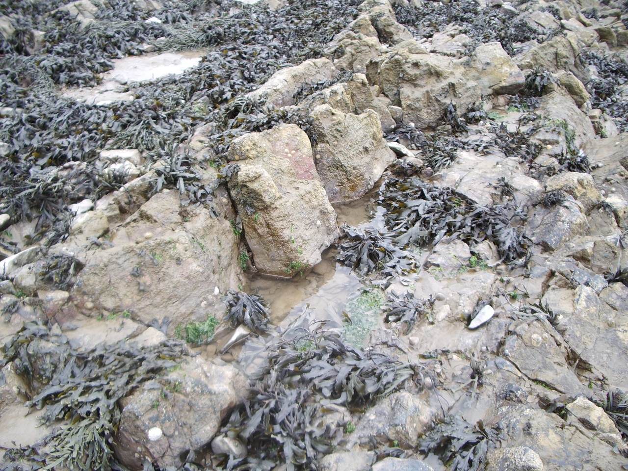 After a few wrong turns, I found the route and made my way down. Once at the foot of the cliffs, there are three distinct parts to the crossing. First, you have to clamber across a little mini-cove full of large boulders. Then, there's a substantial and treacherous bank of jagged, seaweed-covered rock, coated in slimy mud. This is the worst part, since the thick, slippery weed obscures what's underneath, and you have to be very careful not to put your weight on what looks like secure footing, but turns out to be a lethal ankle trap of loose stones balanced shakily on a knife-edge outcrop. Once past that, there's a short mudbank and then you're onto the main ridge itself, a relatively straightforward path to the island made up of fist-to-head-sized pebbles and various bits of weird detritus. Job all but done, right?