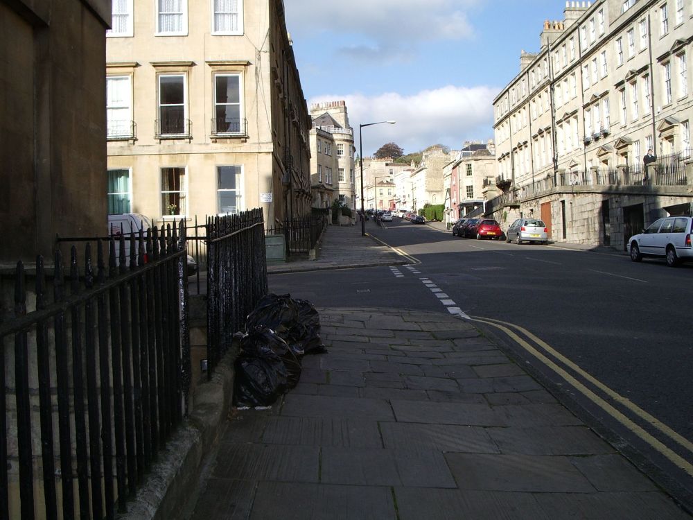There was some fairly major legwork required to get to the game's next location. Lansdown Road is positioned at almost the opposite corner of the city to Widcombe Hill, although that still only makes it a little over a mile away as the crow flies. However, the crow doesn't have to tramp all the way down Widcome Hill into town, then all the way back up the other hill forming the opposite wall of the natural bowl in which Bath cosily nestles. Lansdown Road boasts some of the city's finest examples of Georgian architecture, most of which has been converted into flats and provides housing for the city's humble working folk (or at least, those of them who can still afford the daunting rents required to live in the town's historic centre). The road actually continues up the steepening hill for a couple of miles, but your reporter was a bit puffed-out by this stage, and so the first sign of anything loosely matching the description of "trash" (in this case some plastic binbags awaiting collection on the pavement) did the job.