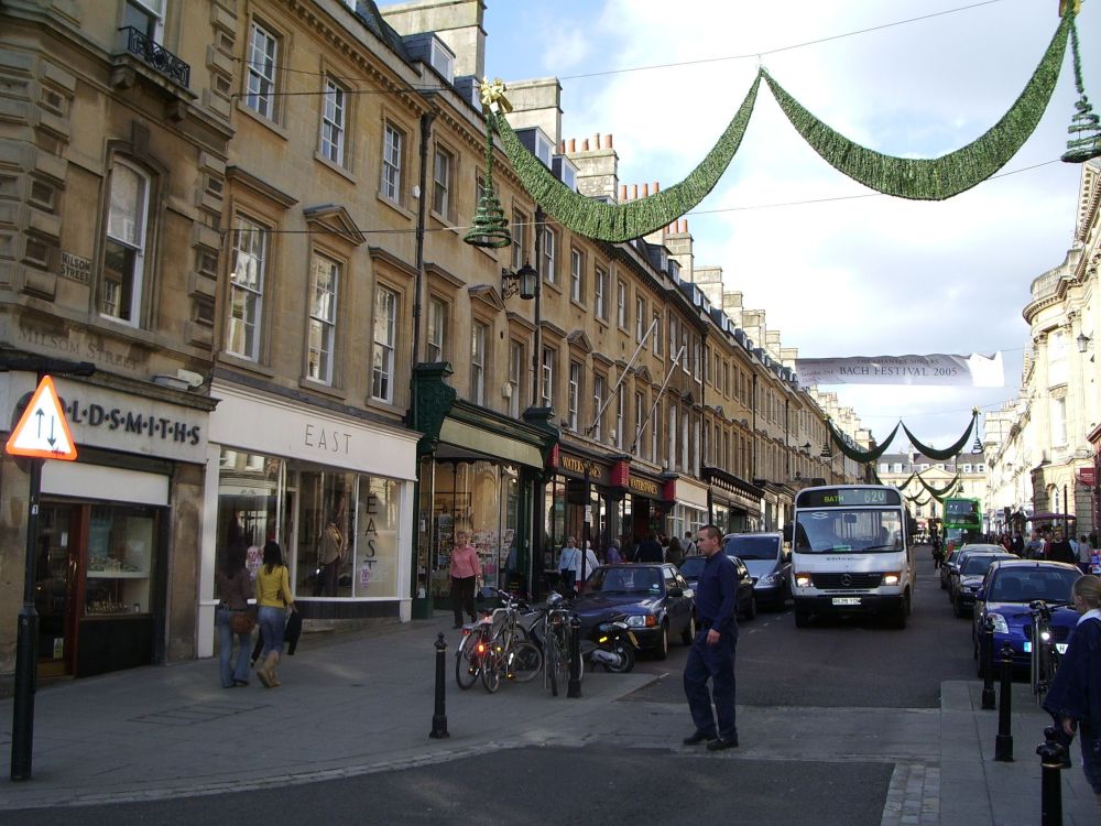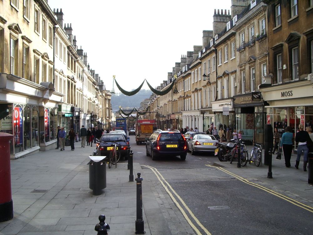 My enlightening voyage of discovery, then, came to an end just a few tens of yards away on Milsom Street, Bath's main shopping thoroughfare for the sophisticated. There's nothing as base as a newsagent or an off-licence or a chip shop on Milsom Street - it's organic herbalists, fragrant-candle emporia, specialist gourmet olive-oil-and-vinegar boutiques, exotic Belgian chocolatiers, fancy jewellers and expensive French restaurants all the way. (Although the hearteningly grotty biker pub Hatchett's, which served as your correspondent's local for many a long year - until its takeover and gentrification into Bath's 175th tasteful wine bar in 2004 - could be stumbled into by the unwary just a few yards away down a narrow side alley.) Appropriately, as I arrived at the top end of the street from Lansdown Road, a rubbish-skip truck was making its way down, and as it trundled away while my digital camera agonisingly slowly came to life (eerily mirroring the feeling of frustration in the game when the bin-lorry pulls off just as you approach it with a full one) I managed to capture both it and a litter-bin for a perfect Trashman-themed end to the day's journey.