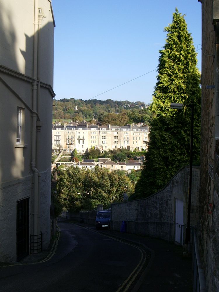 Widcombe Hill itself was considerably less unsettling, though it's one of Bath's not-so-pretty areas. (Nor was it done any favours by the sun at that time of day shining awkwardly into the camera lens, rendering the middle shot above somewhat gloomier than even the reality. I'd have made more effort to circumvent the problem, but as it was I nearly got run over several times standing in the middle of the complex road junction at the bottom of the hill which was the only place it was possible to get a pic of the street that included its nameplate, so I didn't push my luck.) Widcombe was the first place I ever lived when I moved to Bath (for a couple of weeks in a rather spartan bedsit), so I wandered around for a bit hopeful of a little nostalgia trip, but every shop I'd used to go to had been closed and taken over by something much less fun (the newsagent/sweetshop was now a knitting supplies outlet, for example), so I didn't hang around long and instead took a lengthy diversionary hike up the hill and across the top of the town to some of the other (mostly fairly posh) areas of the city I'd never got round to visiting before, and snapped a few picturesque shots of the views.
