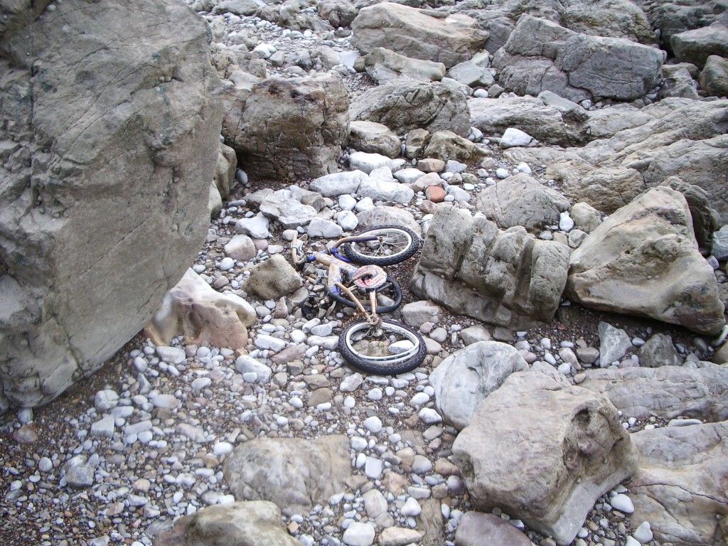 Cam, y'see, knew about something we didn't. Perhaps half-a-mile from Weston's main tourist strip, hidden away from view behind a convenient headland, is the town's second pier. We were all impressed enough by this exciting revelation, and marvelled up close at the rusting ironwork and extremely uncompromising warning signs, along with some of the nastiest razor wire ever. But Cam wanted more, so dutifully we followed as he yomped his way along the precipitous cliff that flanks the pier on both sides, until he found what he very optimistically described as a "path". Not so much a set of steps as one big cliff broken down into several slightly smaller ones, we nevertheless made our way down using a cunning mix of scrambling and falling until, with hardly any broken bones, we were all at the bottom.