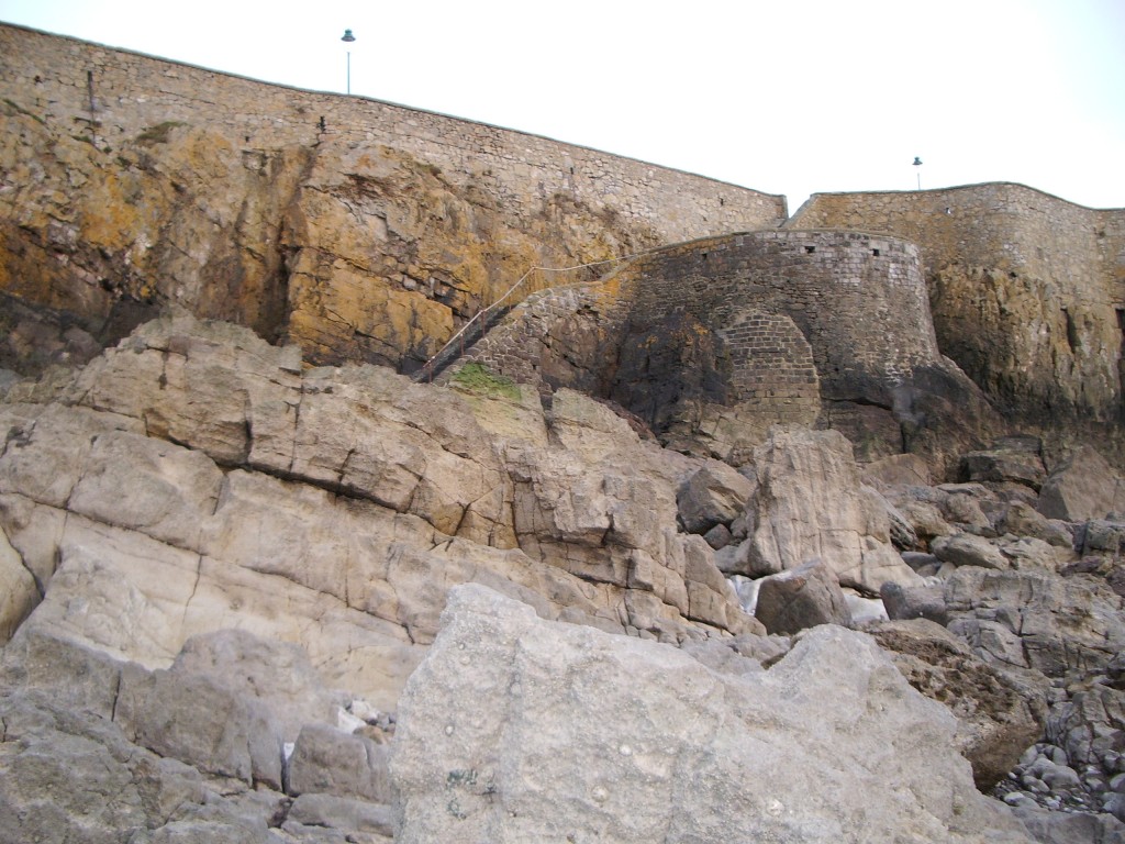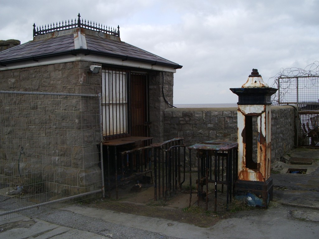 Fate had one last twist of the knife still to come, though. Sullenly I stomped off down a stairway, and spent a while kicking around on the bleak, rocky shore in hollow mimicry of the precarious journey I'd planned to be taking to my now-aborted goal. Having gotten myself to a quite isolated point, several minutes' orienteering away from any permanently dry land, I glanced up and saw the crushing sight of an RNLI lifeboatman making his way across the narrow reconstructed walkway on the pier (picture taken earlier through the razor-wired fence), to the operational lifeboat station which is still located on the island. Had I still been up on the promenade, I could have dashed up and asked him really really nicely if I could come along for five minutes to get a few snaps, in return for a donation or something. But I wasn't. And that, surely, put the tin lid on the whole messed-up day.