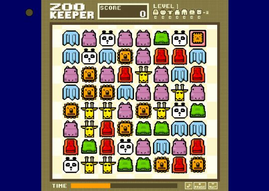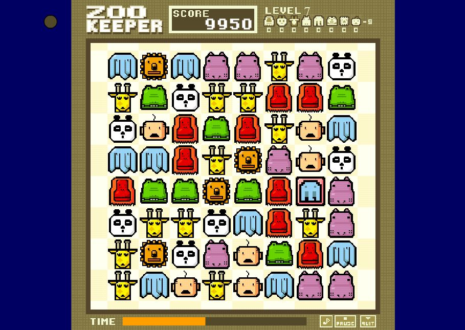 And that's about it, except for the time limit. You start each level with a half-full time bar, which steadily decreases at an ever-faster rate as you move through the levels. You can only reverse the decline by getting lines, which each give you a few extra moments. by level 5 or 6 you can only survive a few seconds without making a line. Oh, and if one type of animals changes its expression to an angry-looking one, it means they're the last one left you haven't reached the target for, so concentrate on those.