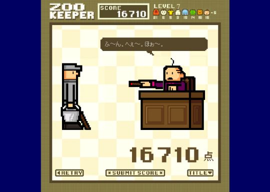 At level 7 the game gets more complicated, with the addition of a new type of animal to the grid. Actually, it appears to be a baby, and while this reporter is personally all in favour of babies being confined to zoos, it's hard to say quite what sort of a plot twist this represents. (In fact, looking at the screenshot above from the game's intro and the baby as seen in the shot below, the baby appears to be the child of the zoo manager. Which is disturbing.)